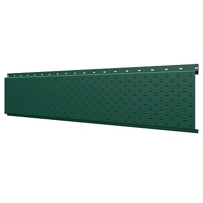 Линеарная потолочно-стеновая панель с ПЕРФОРАЦИЕЙ для вентиляции цвет RAL6005 Зеленый Мох применяется в качестве софитов для подшивы крыши, наружной и внутренней отделки потолков, стен, фронтонов фасада дома в Чайковском.