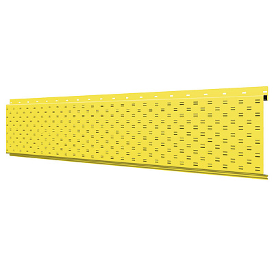 Линеарная потолочно-стеновая панель с ПЕРФОРАЦИЕЙ для вентиляции цвет RAL1018 Желтый применяется в качестве софитов для подшивы крыши, наружной и внутренней отделки потолков, стен, фронтонов фасада дома в Чайковском.